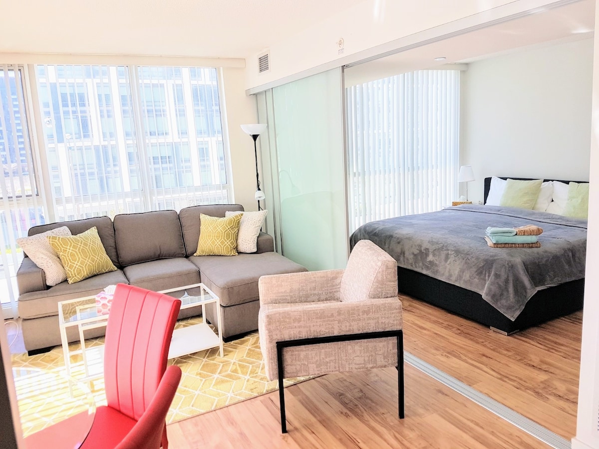 Experience downtown living at its finest in this beautifully furnished 1-bedroom apartment in prestigious City Place. This 600 sq ft unit features a luxurious king bed, comfortable sofa bed, modern stainless steel appliances, and a flexible open-concept design with sliding bedroom doors. Perfect for couples, solo travelers, or small families. Located in the heart of downtown Toronto, steps from restaurants, shopping, entertainment, and major attractions. Your ideal urban getaway awaits!